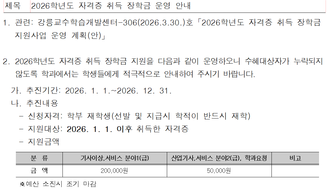 2026학년도 자격증 취득 장학금 운영 안내