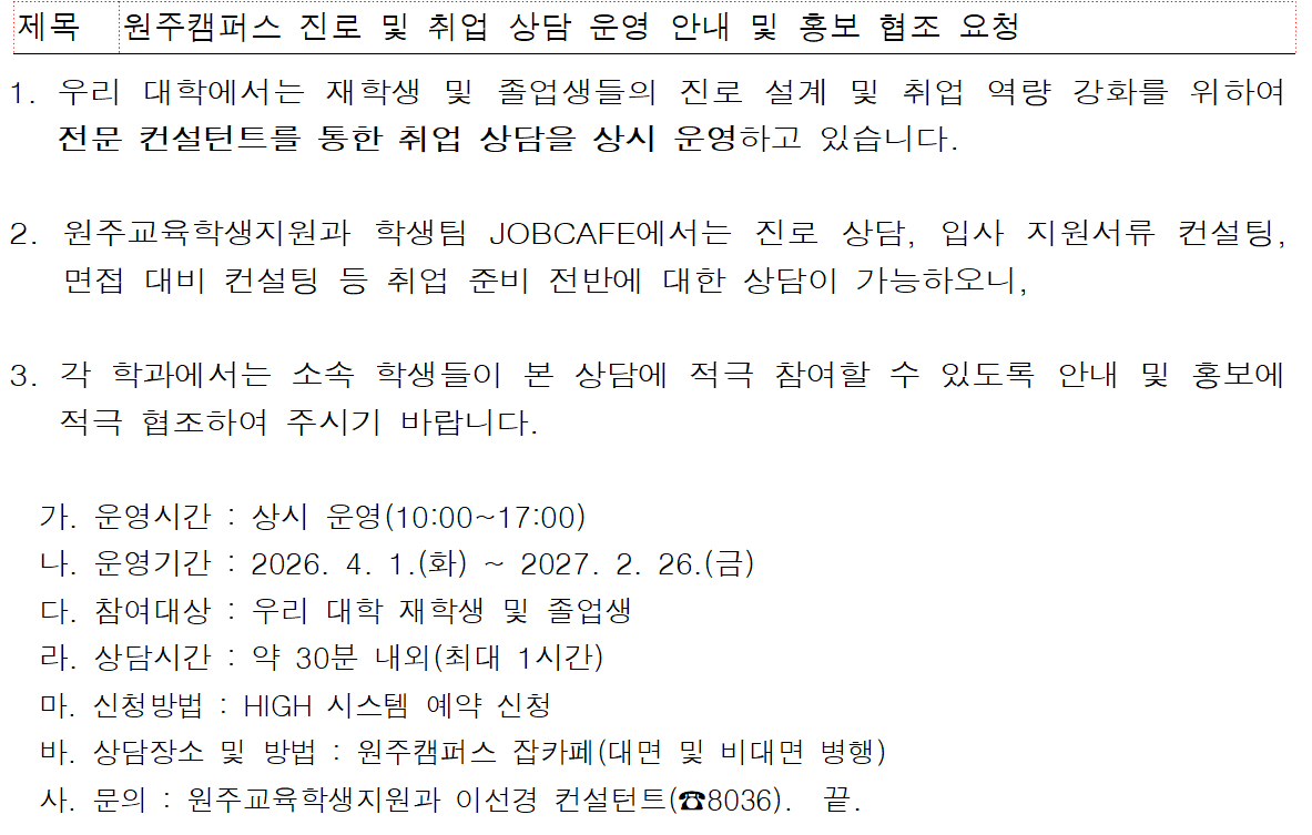 원주캠퍼스 진로 및 취업 상담 운영 안내 및 홍보 협조 요청