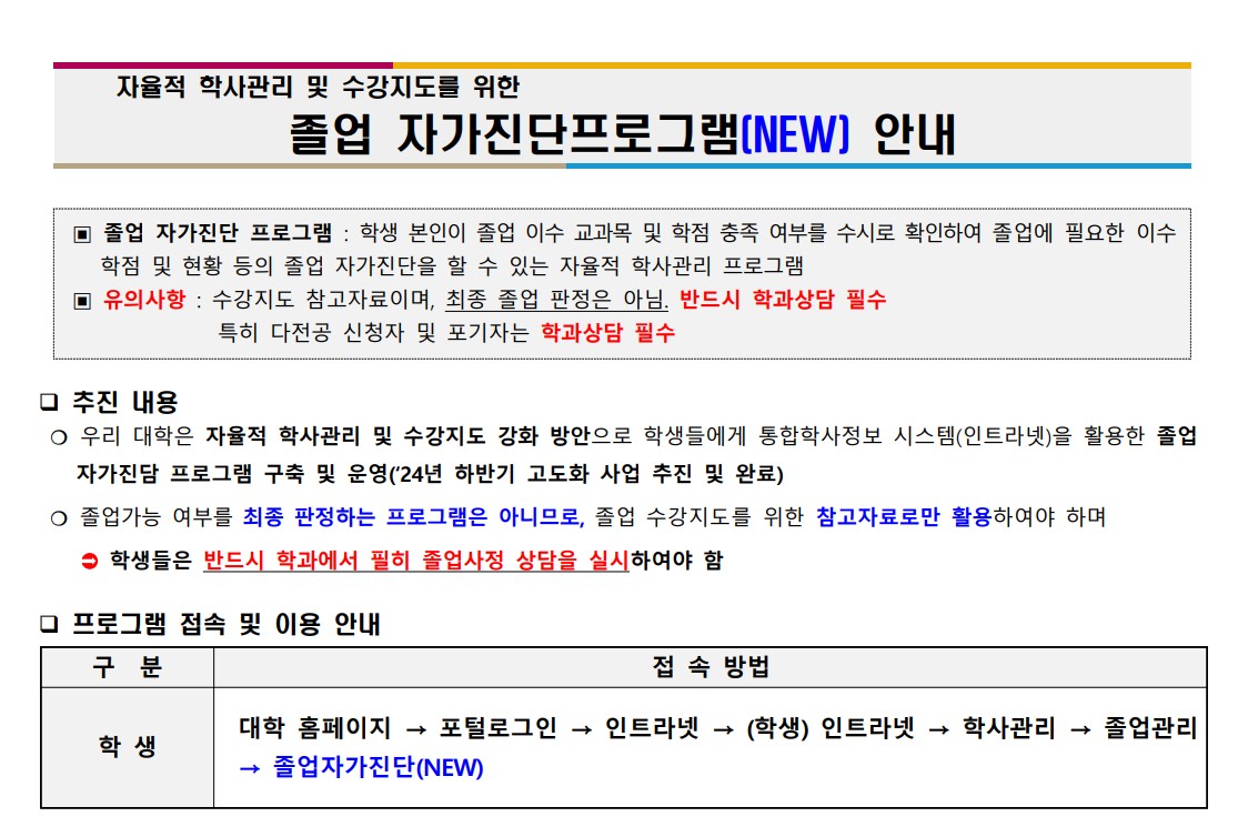 ★ 졸업을 최종 판정하는 프로그램이 아니므로, 학과별 교육과정 이수 학점을 참고하여 학점을 취득하시기 바랍니다.