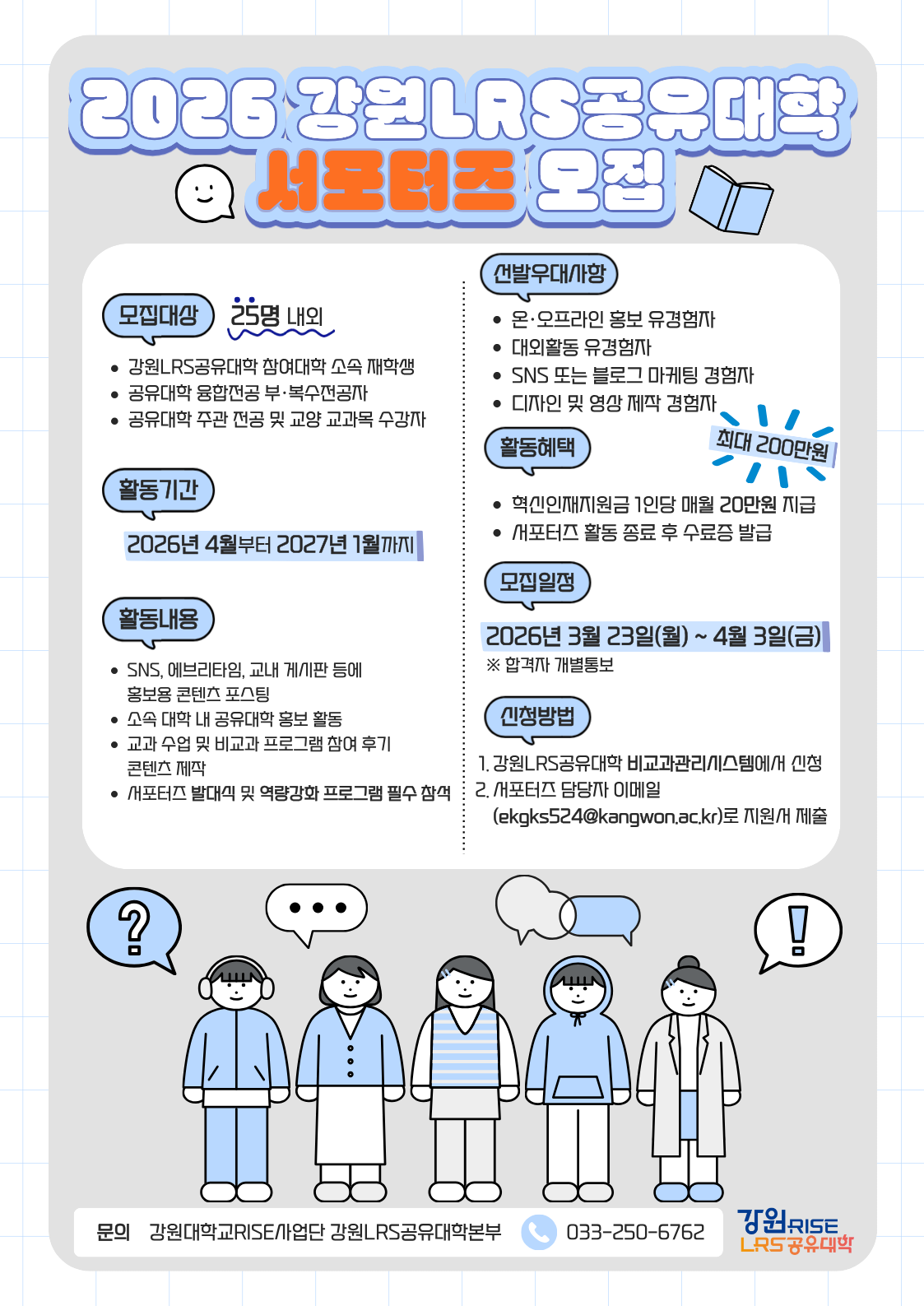 fnctId=bbs,fnctNo=804 [강원대학교RISE사업단 강원LRS공유대학본부] 2026 강원LRS공유대학 서포터즈 모집 안내 작성일 2026.03.27 작성자 김혜리 조회수 149 첨부파일 [붙임1] 2026 강원LRS공유대학 서포터즈 모집 공고 및 지원서식.hwp