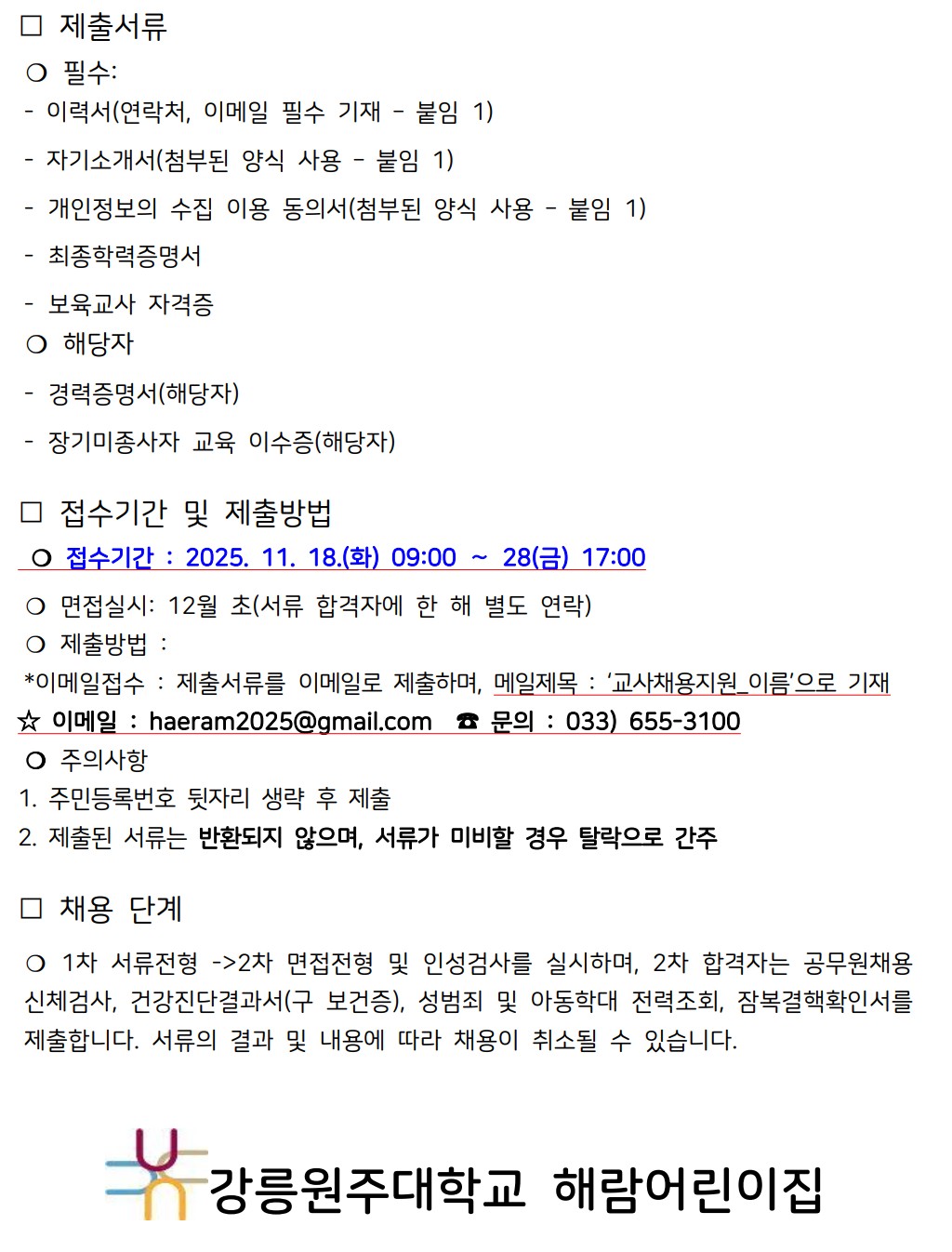 fnctId=bbs,fnctNo=208 강릉원주대학교 해람어린이집 보육교직원 모집 공고 작성일 2025.11.17 작성자 신시원 조회수 1758 첨부파일 해람_교사채용지원양식.hwp 다음글 강원특별자치도자연학습원 직원 공개 채용 신시원 2026-01-12 10:57:21.0 이전글 해군1함대 사랑Dream 어린이집 교직원 채용 신시원 2025-11-10 14:40:03.0 총 17 개의 게시물이 있습니다. 게시물 검색 제목 작성자 게시글 리스트 취업정보 번호 제목 작성자 작성일 댓글 조회수 첨부파일 17 한라소담 어린이집 정교사 모집 공고 신시원 2026.03.09 0 726 0 16 강원특별자치도자연학습원 직원 공개 채용 신시원 2026.01.12 0 1271 1 15 강릉원주대학교 해람어린이집 보육교직원 모집 공고 신시원 2025.11.17 0 1758 1 14 해군1함대 사랑Dream 어린이집 교직원 채용 신시원 2025.11.10 0 1478 0 13 2025학년도 봉대초등학교병설유치원 하계 방학 중 방과후과정 인력 채용 공고 신시원 2025.06.20 0 2819 0 12 하이원 정선 어린이집(강원랜드 직장어린이집(한솔보육재단)) 보육교사 채용 공고 신시원 2024.07.17 0 6474 0 11 <원주소방서어린이집 담임교사 구인> 신시원 2024.03.11 0 6432 0 10 근로복지공단 동해어린이집 보육교직원 채용 공고 신시원 2023.11.24 0 4638 0 9 푸른자연 유치원 교사 구인 안내 신시원 2023.08.14 0 2305 0 8 2023년 강릉원주대학교 해람어린이집 교사 채용공고 신시원 2022.12.14 0 2766 2 처음 12 1 2 다음 페이지 끝
